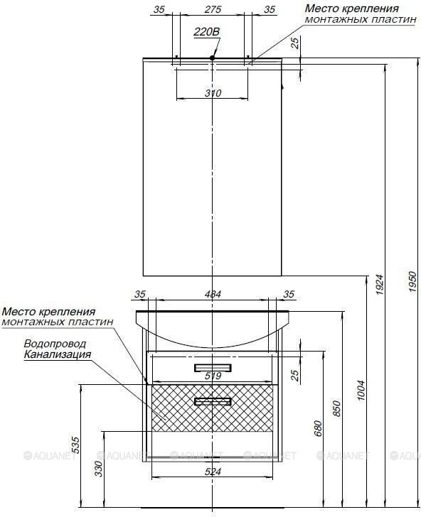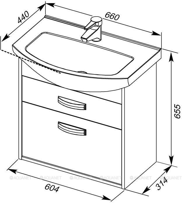 Тумба шириной 65 см имеет универсальный тип установки. Ее можно подвесить или установить на ножки (две или четыре) – оба варианта предусмотрены (это дополнительная опция и ножки в стоимость комплекта не входят).