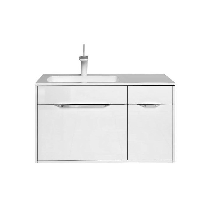 Подвесная тумба с одним основным ящиком, одним потайным ящиком,скрытым за фасадом,одним маленьким ящиком на системе push-to-open, а также 1 дверью с петлями установленными справа. Тумба с умывальником из литьевого мрамора в цвете белый глянец.