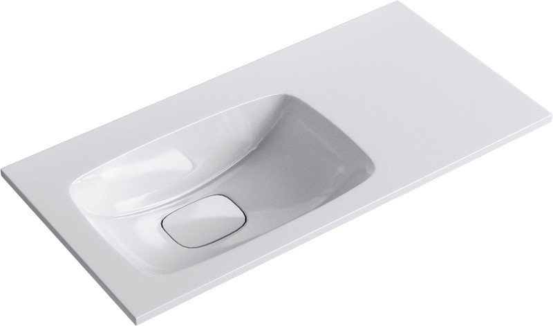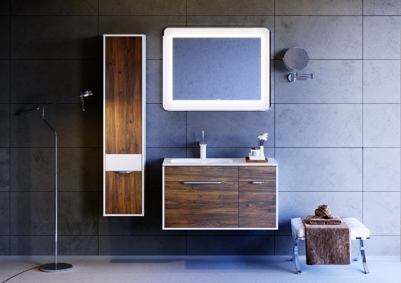 Подвесная тумба с одним основным ящиком, одним потайным ящиком,скрытым за фасадом,одним маленьким ящиком на системе push-to-open, а также 1 дверью с петлями установленными справа. Тумба с умывальником из литьевого мрамора в цвете крафт темный.