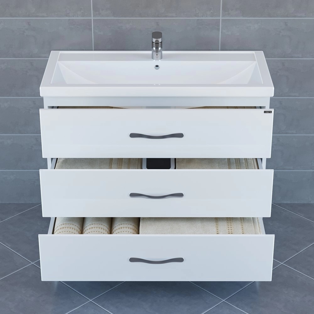 В верхних ящиках организован доступ к подключению коммуникаций.Тумба укомплектована красивой современной прямоугольной раковиной из санфаянса.