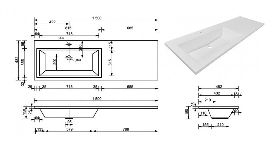 Тумба идет в комплекте с раковиной. Умывальник Даллас 1500*482, левый