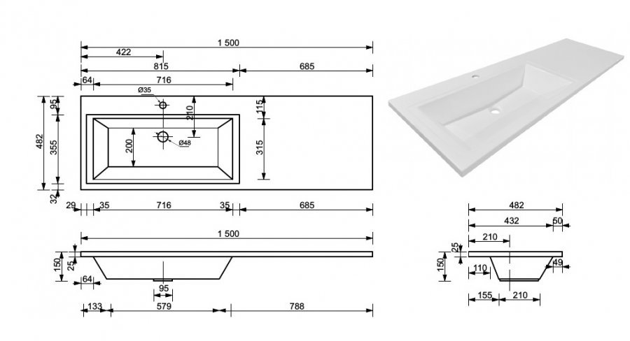 Тумба идет в комплекте с раковиной. Умывальник Даллас 1500*482, левый