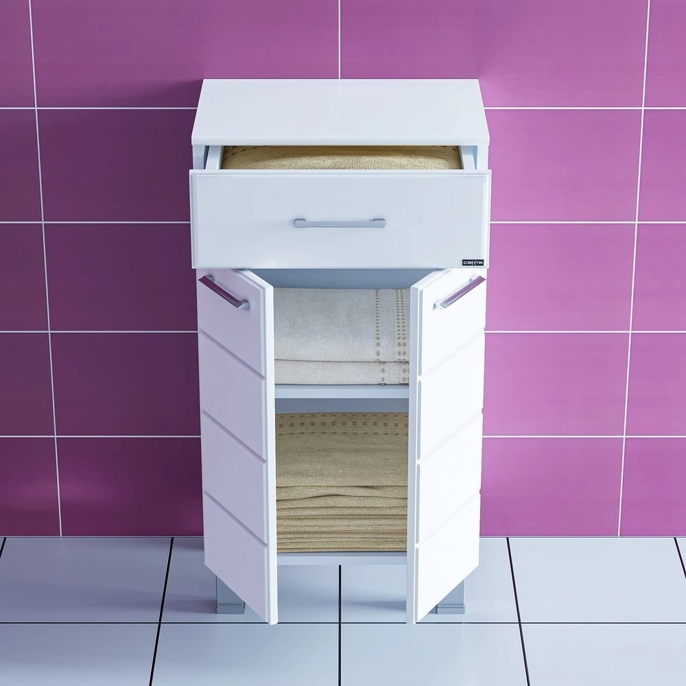 Корпус изделия выполнен из влагостойкого ЛДСП, фасад из МДФ и покрыты высокоглянцевой эмалью.