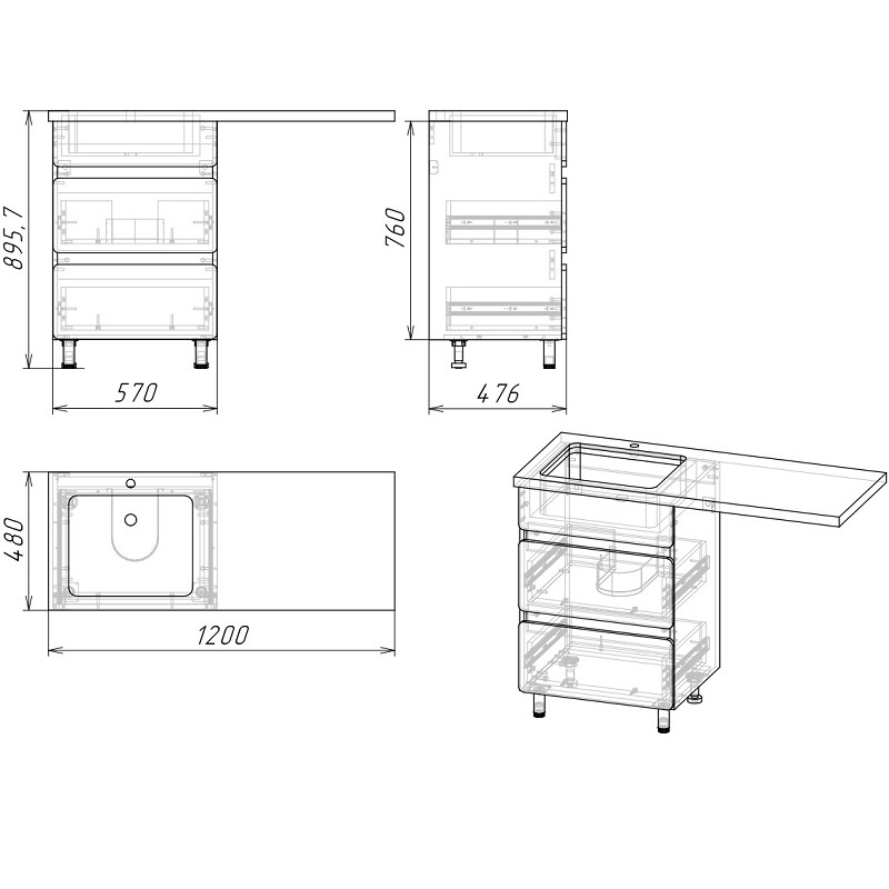 • Опоры металлические, петли с доводчиками, ручки открываются за фасад.