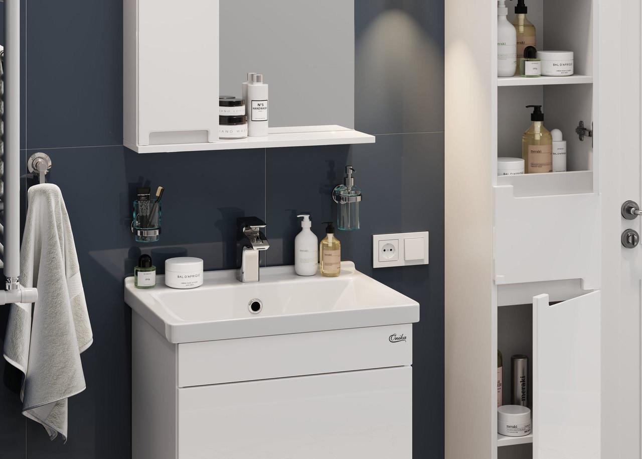 Яркая эстетика строгих форм и блестящий белый глянец - зеркальный шкаф Onika ДЖОРДАН 60.12 создан, чтобы наполнить пространство воздухом и сделать особенный свободный интерьер комнаты.
