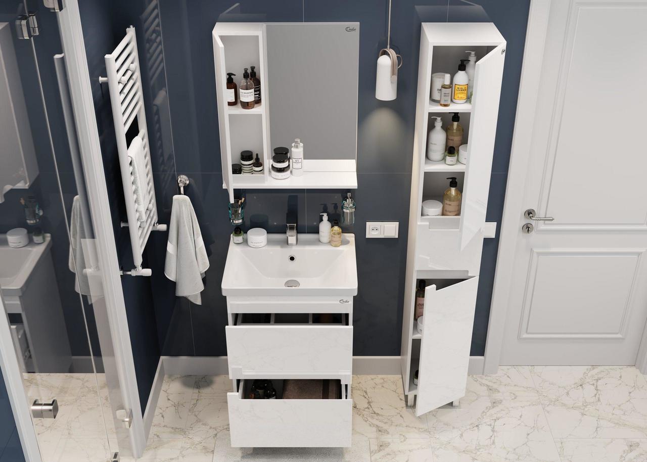 Современный функционал позволяет удобно расположить все необходимое: пространство за распашной дверцей с механизмом плавного закрывания справа от зеркала позволяет разместить все необходимые мелочи, а открытую полку снизу можно использовать для декора или часто используемых предметов.
