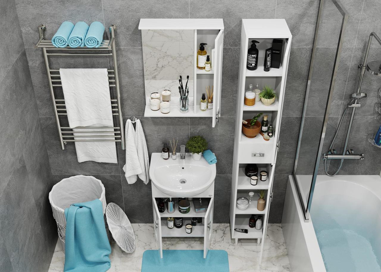 Справа от зеркала за распашной дверцей с механизмом плавного закрывания расположено отделение для хранения, разделенное двумя горизонтальными полочками, под зеркалом - открытая полочка для косметических средств или декоративных элементов.