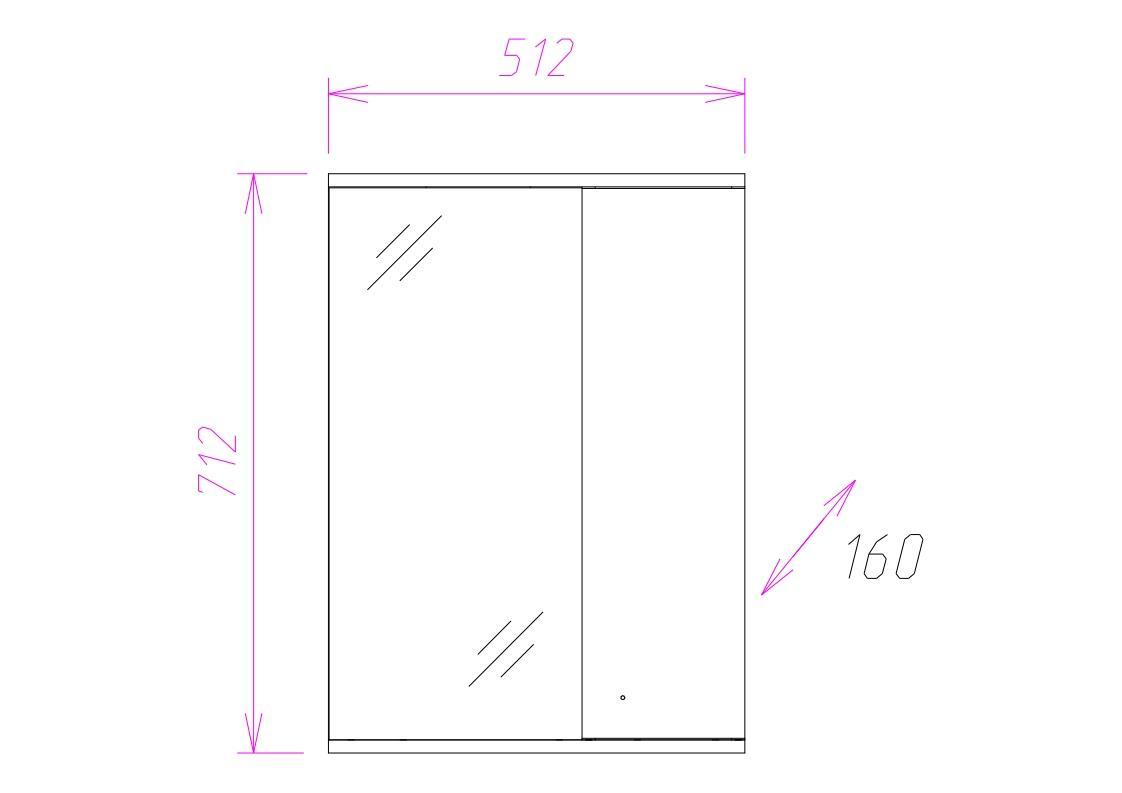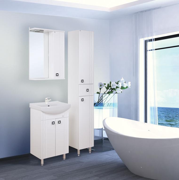 Справа от зеркала за распашной дверцей с механизмом плавного закрывания расположено отделение для хранения, разделенное на две части горизонтальной полочкой, под зеркалом - открытая полочка для косметических средств или декоративных элементов.