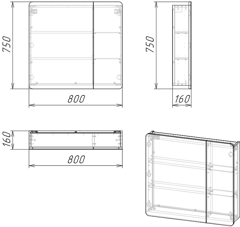 • Петли с доводчиками, открывание за фасад, внутри полочки как справа, так и слева, плавно скругленные углы.