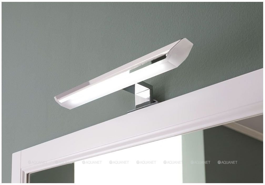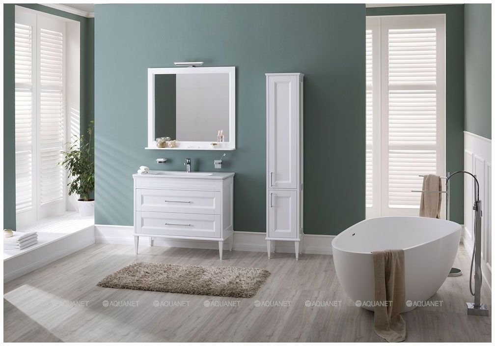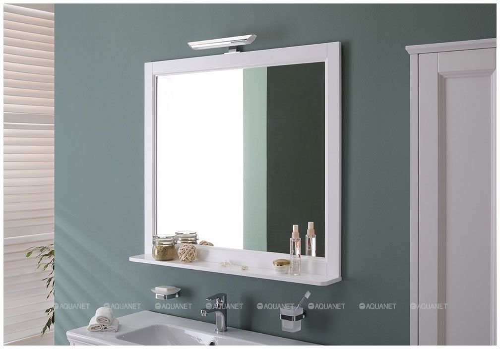 Зеркало Aquanet Бостон М 100 белого цвета оправлено в изящную рамку из МДФ с небольшой полочкой внизу длиной 100 см.