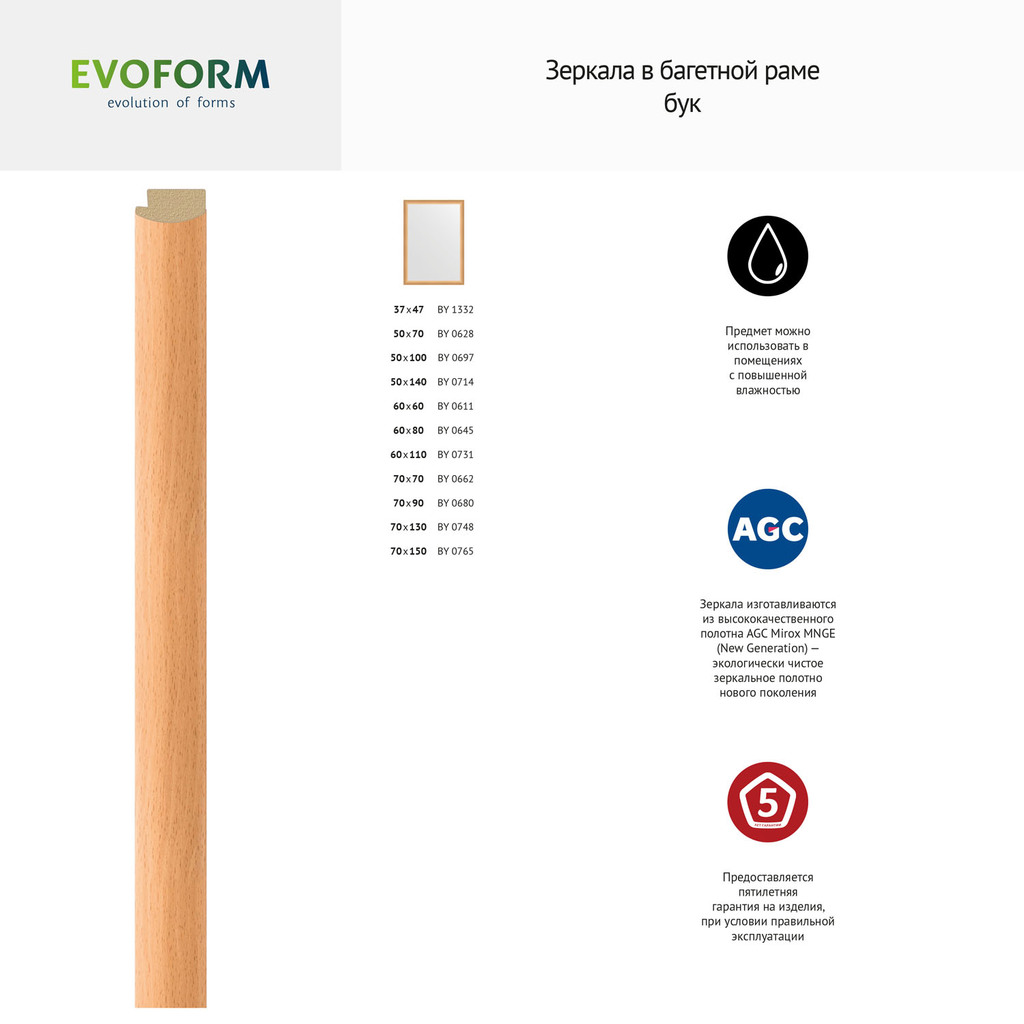 Зеркало в багетной раме - бук 37 mm (50х100 cm) (EVOFORM); Название багета: бук 37 mm; Вес нетто: 4,998; Материал упаковки: Картон/Пленка; Монтаж: Настенный; Крепление (в комплекте): Винт-костыль; Материал: Стекло; Полиуретан; Торговая марка стекла: AGC Mirox MNGE; Форма зеркала: Прямоугольник; Обработка кромки зеркального полотна: Шлифованная; Фацет (есть или нет): -; Гарантия 5 лет при условии правильной эксплуатации; Не подлежит обязательной сертификации; Зеркала изготавливаются из высококачественного полотна AGC Mirox MNGE (New Generation) — экологически чистое зеркальное полотно нового поколения. Можно использовать в помещениях с повышенной влажностью.