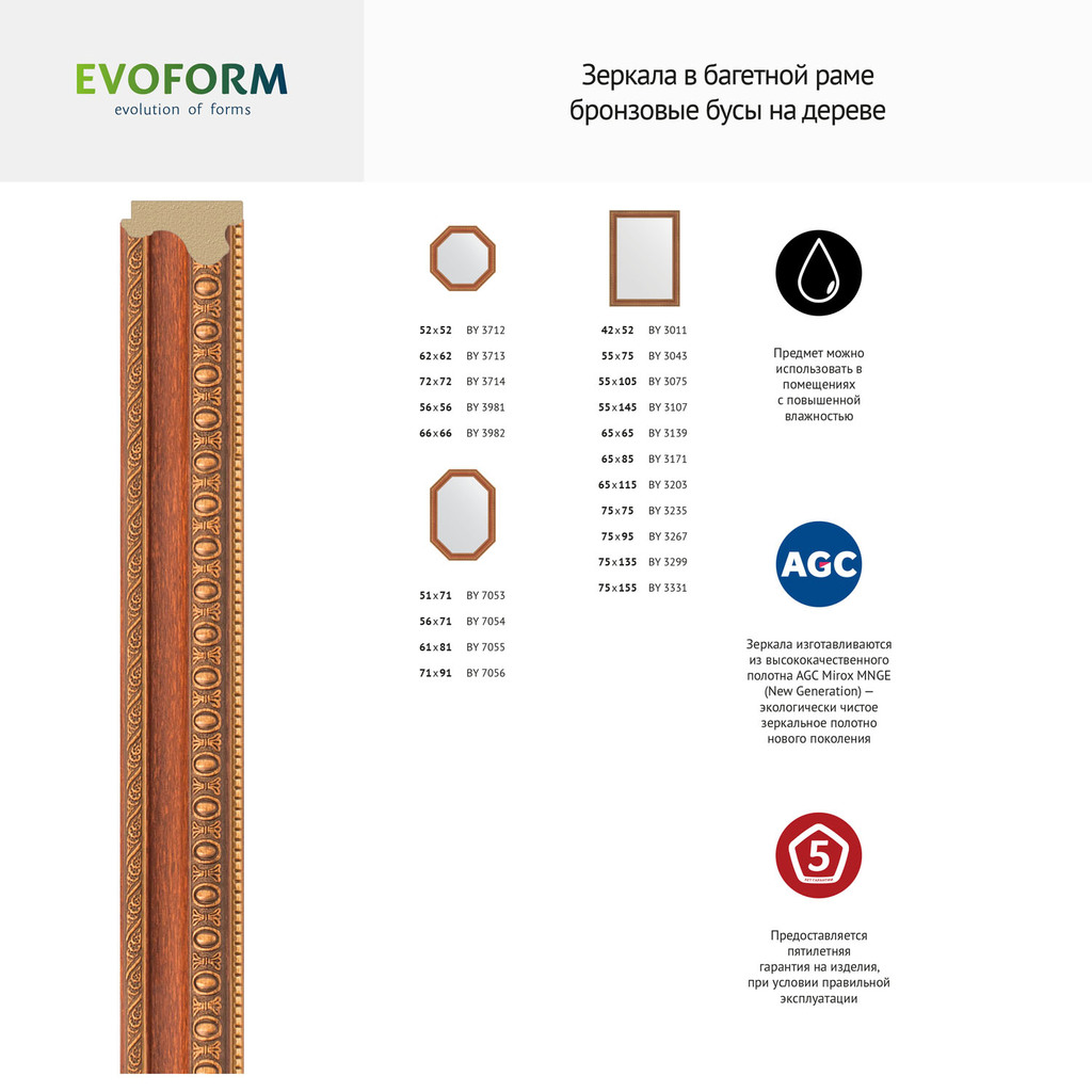 Зеркало в багетной раме - бронзовые бусы на дереве 60 mm (65х65 cm) (EVOFORM); Название багета: бронзовые бусы на дереве 60 mm; Вес нетто: 4,14; Материал упаковки: Картон/Пленка; Монтаж: Настенный; Крепление (в комплекте): Винт-костыль; Материал: Стекло; Полиуретан; Торговая марка стекла: AGC Mirox MNGE; Форма зеркала: Квадрат; Обработка кромки зеркального полотна: Шлифованная; Фацет (есть или нет): -; Гарантия 5 лет при условии правильной эксплуатации; Не подлежит обязательной сертификации; Зеркала изготавливаются из высококачественного полотна AGC Mirox MNGE (New Generation) — экологически чистое зеркальное полотно нового поколения. Можно использовать в помещениях с повышенной влажностью.