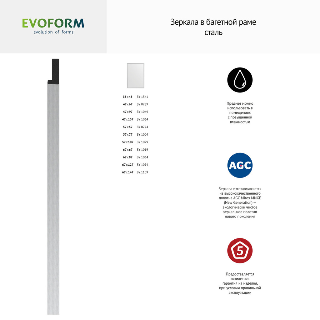 Зеркало в багетной раме - сталь 20 mm (66х66 cm) (EVOFORM); Название багета: сталь 20 mm; Вес нетто: 5,1744; Материал упаковки: Картон/Пленка; Монтаж: Настенный; Крепление (в комплекте): Винт-костыль; Материал: Стекло; Полиуретан; Торговая марка стекла: AGC Mirox MNGE; Форма зеркала: Квадрат; Обработка кромки зеркального полотна: Шлифованная; Фацет (есть или нет): -; Гарантия 5 лет при условии правильной эксплуатации; Не подлежит обязательной сертификации; Зеркала изготавливаются из высококачественного полотна AGC Mirox MNGE (New Generation) — экологически чистое зеркальное полотно нового поколения. Можно использовать в помещениях с повышенной влажностью.