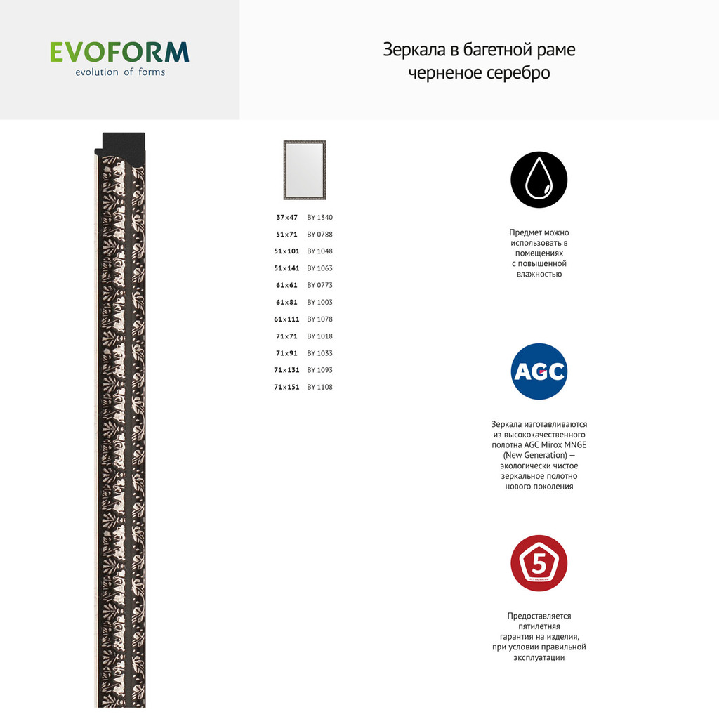 Зеркало в багетной раме - черненое серебро 38 mm (70х130 cm) (EVOFORM); Название багета: черненое серебро 38 mm; Вес нетто: 9,604; Материал упаковки: Картон/Пленка; Монтаж: Настенный; Крепление (в комплекте): Винт-костыль; Материал: Стекло; Полиуретан; Торговая марка стекла: AGC Mirox MNGE; Форма зеркала: Прямоугольник; Обработка кромки зеркального полотна: Шлифованная; Фацет (есть или нет): -; Гарантия 5 лет при условии правильной эксплуатации; Не подлежит обязательной сертификации; Зеркала изготавливаются из высококачественного полотна AGC Mirox MNGE (New Generation) — экологически чистое зеркальное полотно нового поколения. Можно использовать в помещениях с повышенной влажностью.