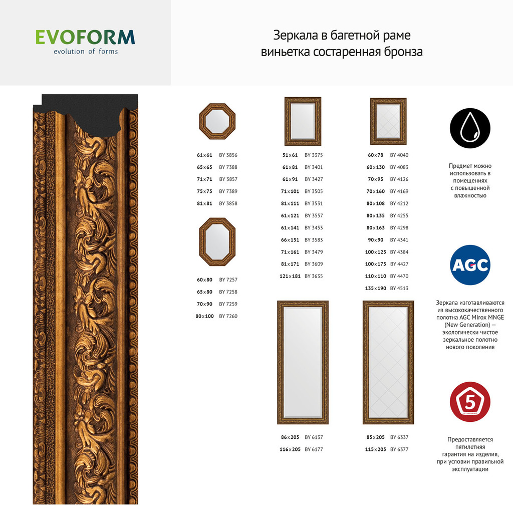 Зеркало с фацетом в багетной раме - виньетка состаренная бронза 109 mm (60х140 cm) (EVOFORM); Название багета: виньетка состаренная бронза 109 mm; Вес нетто: 9,87; Материал упаковки: Картон/Пленка; Монтаж: Настенный; Крепление (в комплекте): Винт-костыль; Материал: Стекло; Полиуретан; Торговая марка стекла: AGC Mirox MNGE; Форма зеркала: Прямоугольник; Обработка кромки зеркального полотна: Фацет; Фацет (есть или нет): 25; Гарантия 5 лет при условии правильной эксплуатации; Не подлежит обязательной сертификации; Зеркала изготавливаются из высококачественного полотна AGC Mirox MNGE (New Generation) — экологически чистое зеркальное полотно нового поколения. Можно использовать в помещениях с повышенной влажностью.