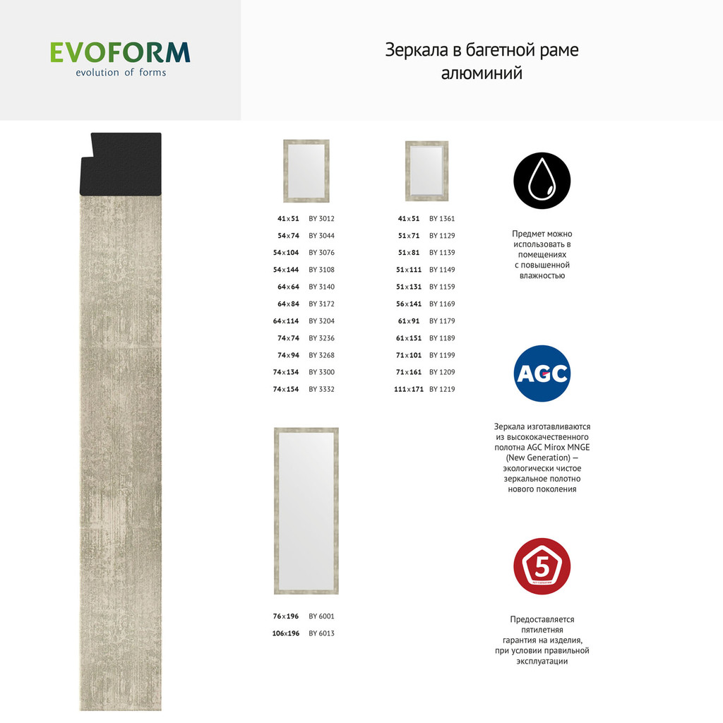 Зеркало с фацетом в багетной раме - алюминий 61 mm (71х161 cm) (EVOFORM); Название багета: алюминий 61 mm; Вес нетто: 18,56; Материал упаковки: Картон/Пленка; Монтаж: Настенный; Крепление (в комплекте): Винт-костыль; Материал: Стекло; Полиуретан; Торговая марка стекла: AGC Mirox MNGE; Форма зеркала: Прямоугольник; Обработка кромки зеркального полотна: Фацет; Фацет (есть или нет): 25; Гарантия 5 лет при условии правильной эксплуатации; Не подлежит обязательной сертификации; Зеркала изготавливаются из высококачественного полотна AGC Mirox MNGE (New Generation) — экологически чистое зеркальное полотно нового поколения. Можно использовать в помещениях с повышенной влажностью.