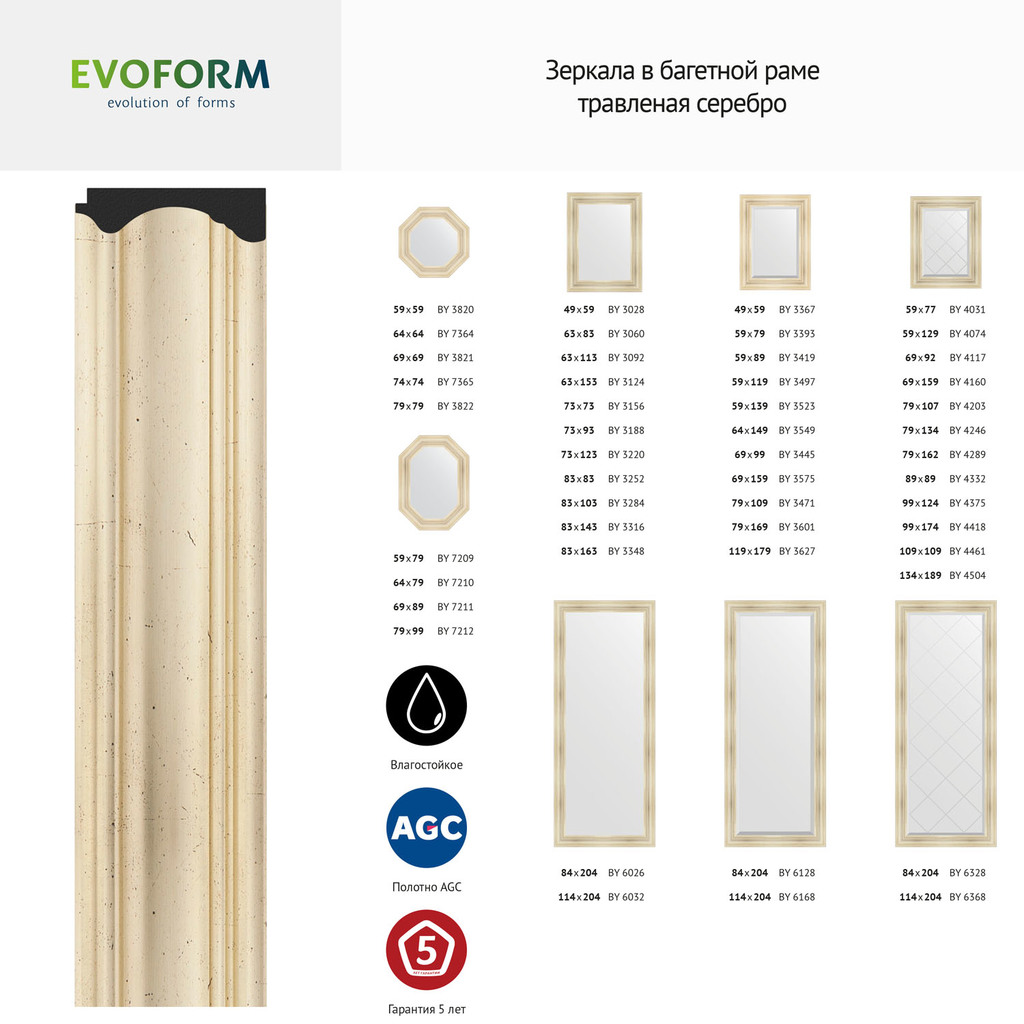 Зеркало с гравировкой в багетной раме - травленое серебро 99 mm (69x158 cm) (EVOFORM); Вес нетто (в кг): 10,11; Материал упаковки: Картон/Пленка; Монтаж: Настенный; Крепление (в комплекте): Винт-костыль, дюбель; Материал: Стекло; Полиуретан; Торговая марка стекла: AGC Mirox MNGE; Форма зеркала: Прямоугольник; Толщина зеркального полотна в мм: 4; Обработка кромки зеркального полотна: Фацет в мм 20; Гарантия 5 лет при условии правильной эксплуатации; Не подлежит обязательной сертификации; Зеркала изготавливаются из высококачественного полотна AGC Mirox MNGE (New Generation) — экологически чистое зеркальное полотно нового поколения. Можно использовать в помещениях с повышенной влажностью.