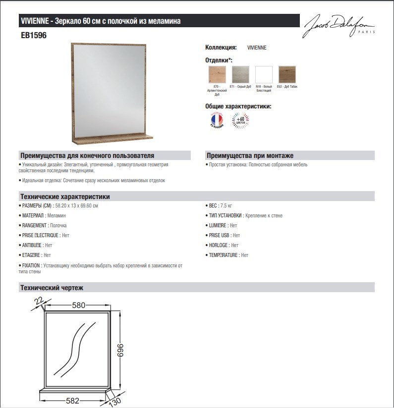 Зеркало Jacob Delafon Vivienne 60 арлингтонский дуб с полочкой - цена 14400 руб. Оформить заказ и купить компонент Jacob Delafon Vivienne 60 арлингтонский дуб с полочкой в Москве в нашем интернет магазине можно по тел 8 (919) 991-95-00 или добавив товар в корзину.