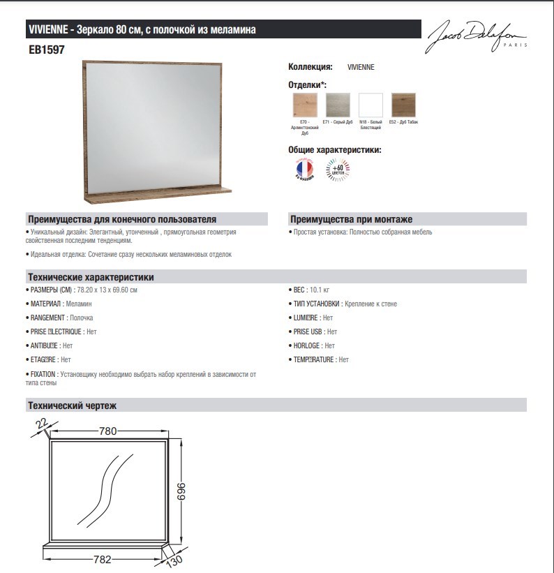 Зеркало Jacob Delafon Vivienne 80 арлингтонский дуб с полочкой - цена 18702 руб. Оформить заказ и купить компонент Jacob Delafon Vivienne 80 арлингтонский дуб с полочкой в Москве в нашем интернет магазине можно по тел 8 (919) 991-95-00 или добавив товар в корзину.