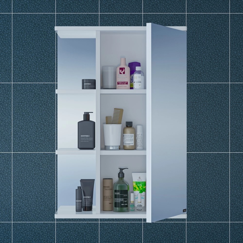 Шкаф оснащен одной дверцей с двойным зеркалом на петлях с доводчиками для плавного и бесшумного открытия и закрытия.