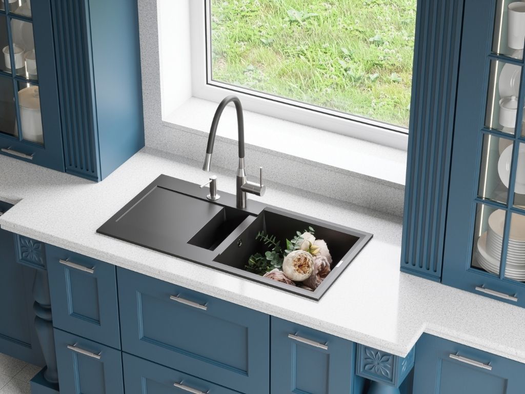Мойка черного цвета создана из материала «Tetogranit Metal».