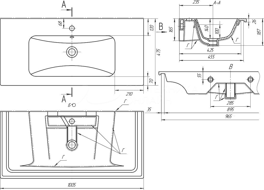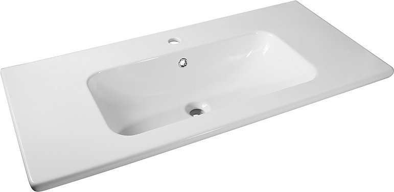 Раковина с отверстием под перелив, имеет одно отверстие под смеситель, расположение в центре