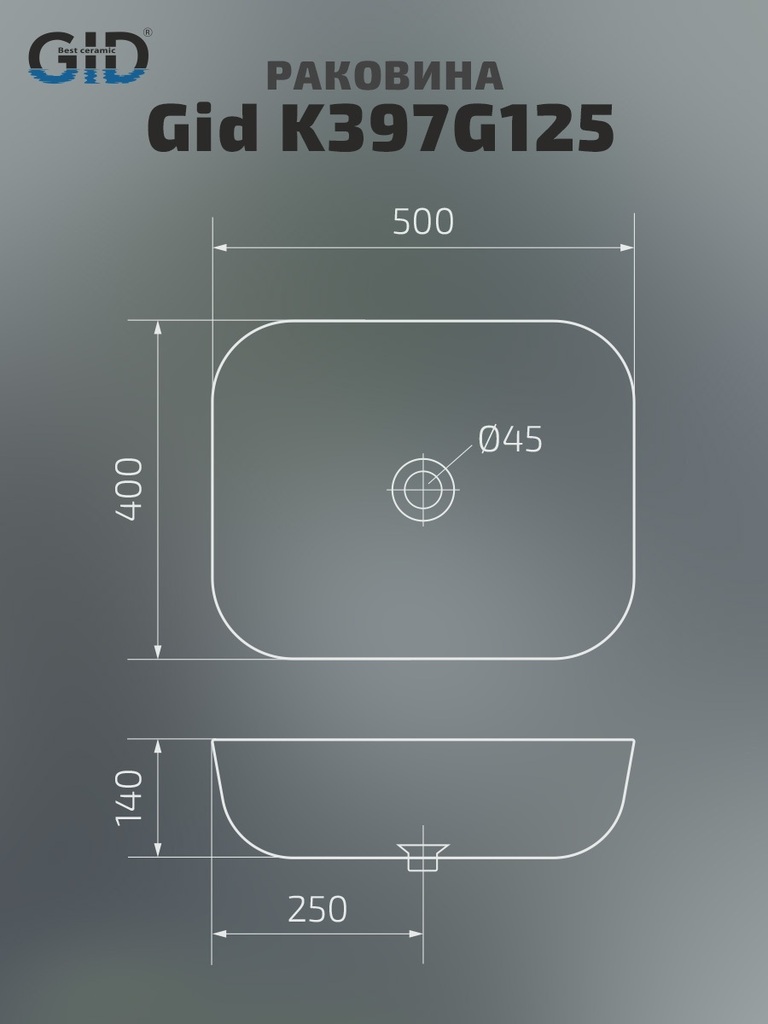 Накладная раковина, донный клапан "Хром" или в цвет раковины (по наличию) Gid Раковина Gid K397G125 54402 накладная под камень глянцевая 50x40x14