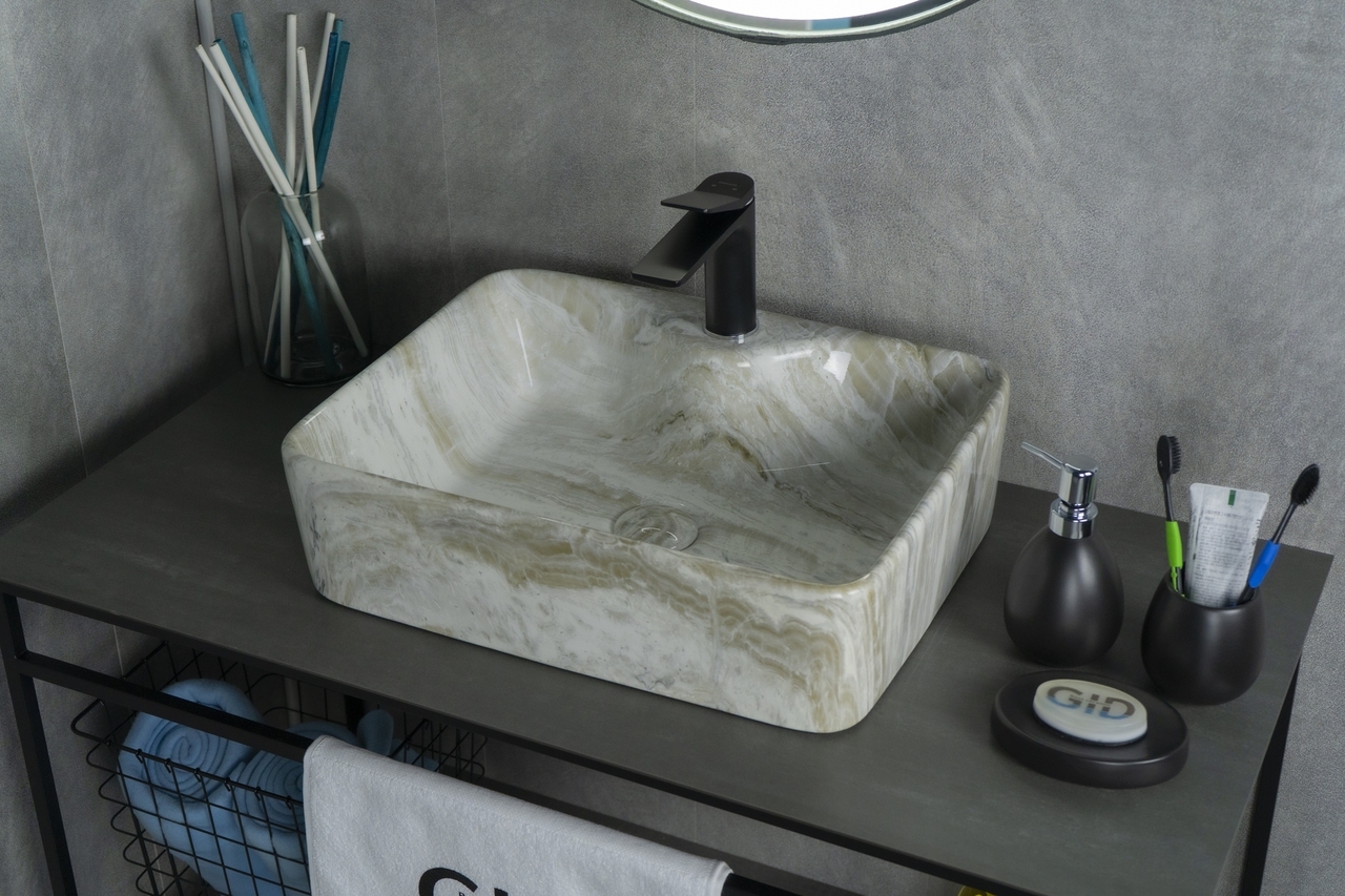 Серия Geometrico с прямоугольной формой: стиль и практичность с испанским качеством и европейскими стандартами. Раковина накладная GiD Mnc605 — стильная модель прямоугольной формы, изготовленная из высококачественной керамики с глянцевой поверхностью, имитирующей натуральный камень. Она оснащена отверстием для смесителя, что делает её практичным выбором для ванных комнат в любом стиле. Раковина предназначена для установки на столешницу или мебель, обеспечивая удобство монтажа и гармоничное сочетание с интерьером. Модель отличается долговечностью, простотой ухода и элегантным дизайном, что делает её отличным решением для создания комфортного и стильного