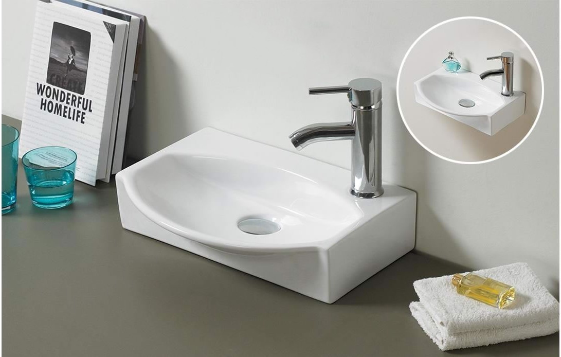 Крепится на стену, устанавливается на тумбу, на столешницу