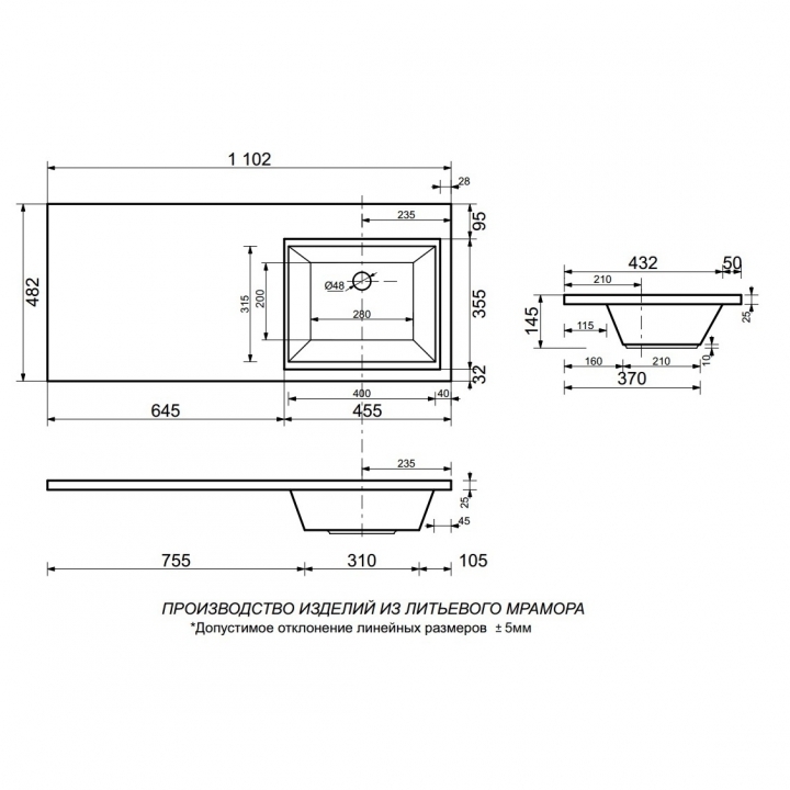 Габариты столешницы (ШхДхВ): 1102х482х25 мм.