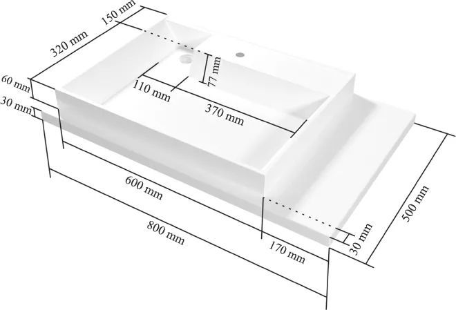 Умывальник СанТа Юпитер 800х500 выполнен в современном стиле, монолитная раковина из литьевого мрамора в виде прямоугольной чаши, встроенной в столешницу.