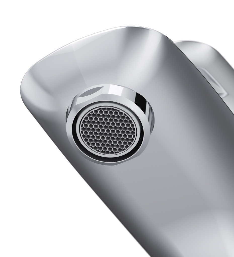 Эргономичность: безупречно продуманная форма ручки идеально ложится в ладонь. Наклон и плавный изгиб корпуса смесителя обеспечивают удобство использования на высокой раковине.