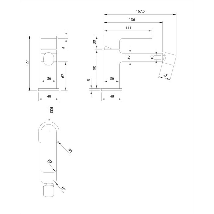 - длина излива: 14,7 см, - высота излива: 7,6 см, - полная высота смесителя: 12,7 см.