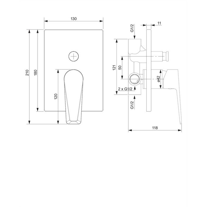 - размеры розетки: 13x18 см; - минимальная глубина для установки: 6 см; - два входа (для горячей и холодной воды): 1/2”; - два выхода смешанной воды: 1/2”; - элемент скрытого монтажа в комплекте.