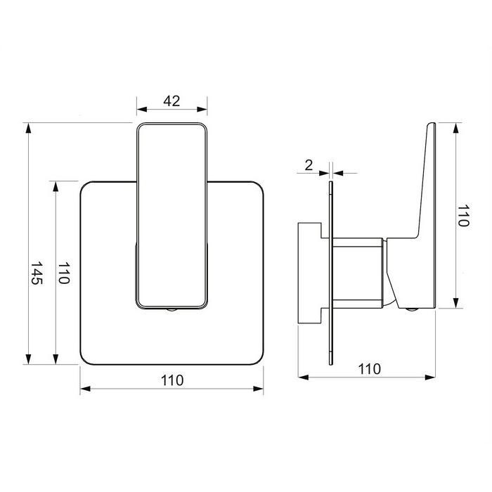 - размеры розетки: 11x11 см; - минимальная глубина для установки: 5 см; - два входа (для горячей и холодной воды): 1/2”; - один выход смешанной воды: 1/2”; - элемент скрытого монтажа в комплекте.