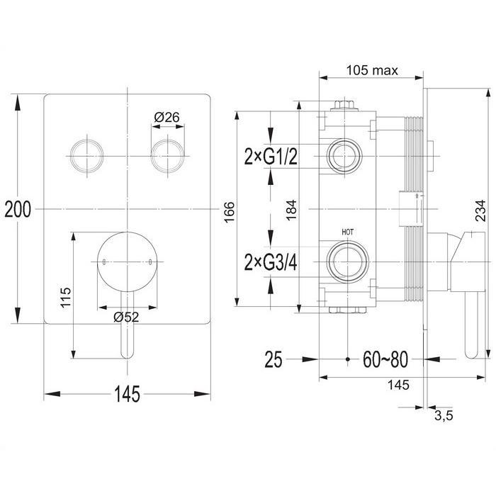 - два входа (для горячей и холодной воды): 3/4”;