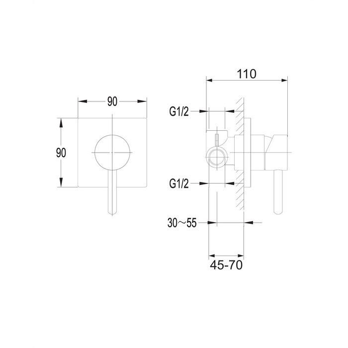 - размеры розетки: 9x9 см; - минимальная глубина для установки: 4,5 см; - два входа (для горячей и холодной воды): 1/2”; - один выход смешанной воды: 1/2”; - элемент скрытого монтажа в комплекте.
