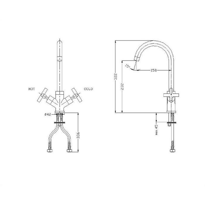 - поворотный излив; - длина излива: 16 см; - высота излива воды: 23 см; - полная высота смесителя: 32 см.