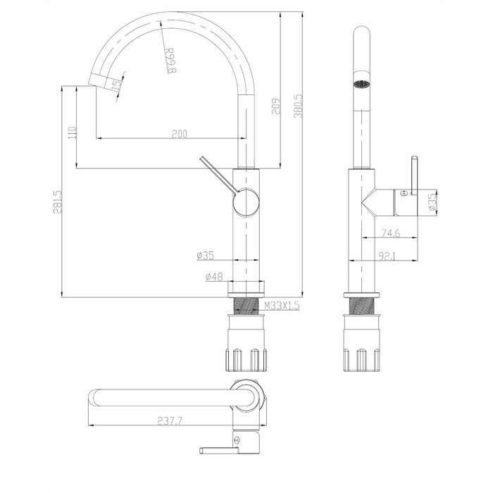 - поворотный излив; - длина излива: 20 см; - высота излива воды: 28,1 см; - полная высота смесителя: 38 см; - покрытие: PVD, которое характеризуется высокой гладкостью поверхности, прочностью и устойчивостью к механическим повреждениям.