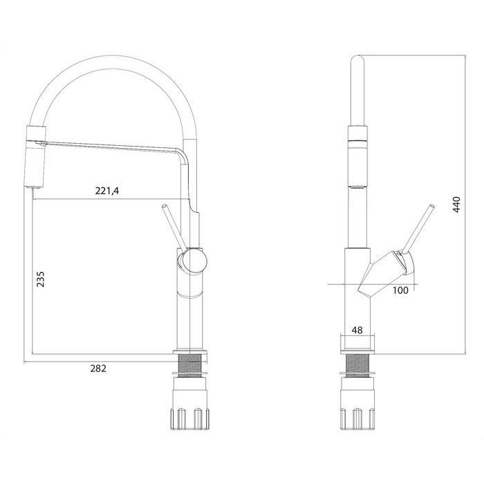- съемный излив; - поворотный излив; - длина излива: 22,1 см; - высота излива воды: 23,5 см; - полная высота смесителя: 44 см; - душ 1-функциональный.