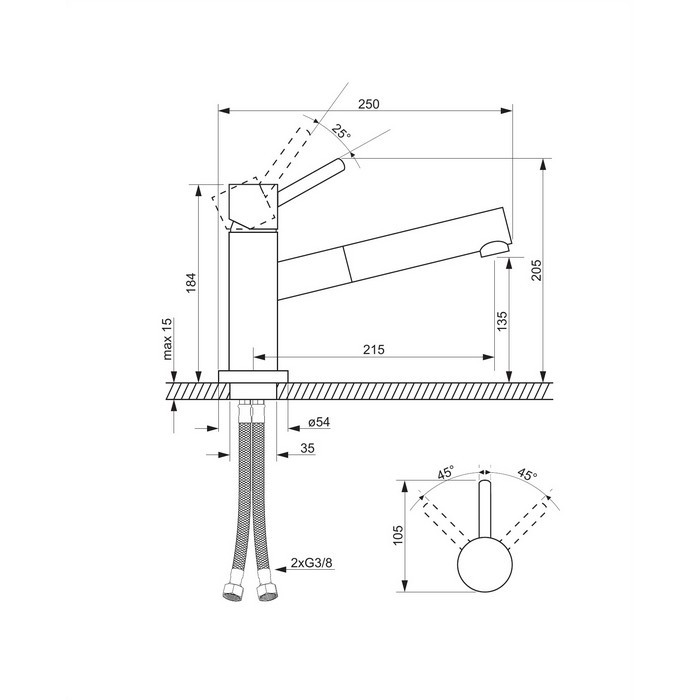 - из нержавеющей стали; - поворотный излив; - выдвижной излив; - длина излива: 21,5 см; - высота излива воды: 13,5 см; - полная высота смесителя: 18,4 см; - душ 1-функциональный; - покрытие: INOX.