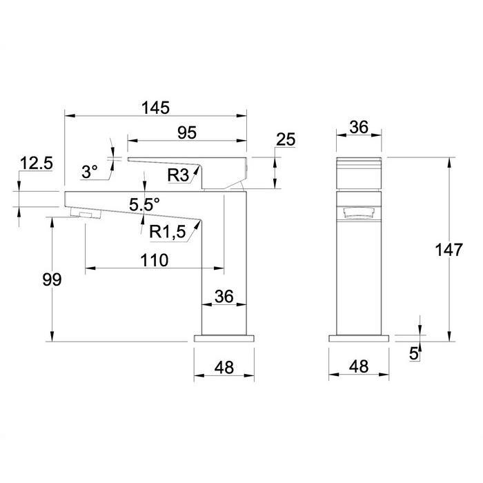 - длина излива: 11 см; - высота излива: 9,9 см; - полная высота смесителя: 14,7 см; - аэратор, ограничивающий расход воды до 6 л/мин.; - керамический картридж: ø25 мм; - технология EcoWater (сокращение расхода воды до 50%).