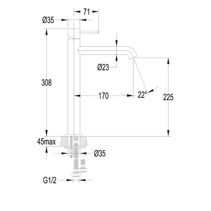 - длина излива: 17 см; - высота излива: 22,5 см; - полная высота смесителя: 30,5 см; - керамический картридж: ø25 мм; - покрытие: PVD, которое характеризуется высокой гладкостью поверхности, прочностью и устойчивостью к механическим повреждениям.