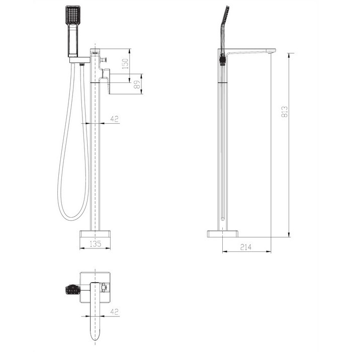 - длина излива: 20,5 см; - высота излива: 83,9 см; - полная высота смесителя: 86 см; - лейка душевая с 1-ой функцией; - душевой шланг в оболочке ПВХ, длина: 150 см; - держатель для лейки с защитным вкладышем; - элемент скрытого монтажа в комплекте.