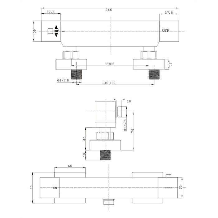 - ограничитель горячей воды на 38°C; - ширина: 26,6 см; - высота: 6 см.