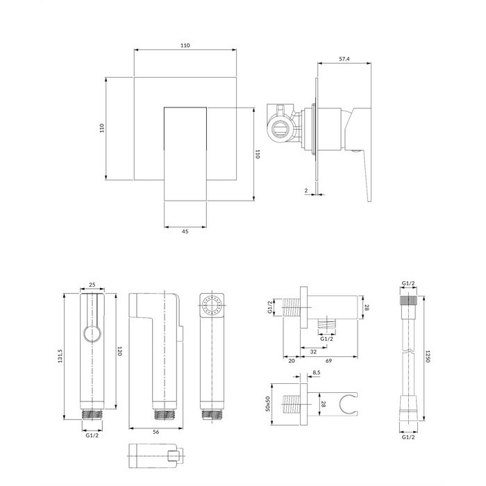 - смеситель для душа скрытого монтажа (FR7145CR); - лейка для биде (BIDETTA-R/KCR); - душевой шланг в стальной оплетке (022-XCR), длина: 125 см; - угловой соединительный элемент (8876CR), с держателем для душевой лейки.