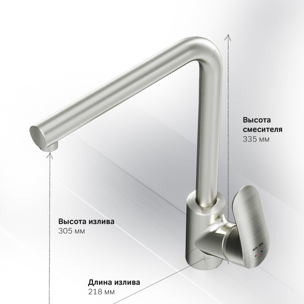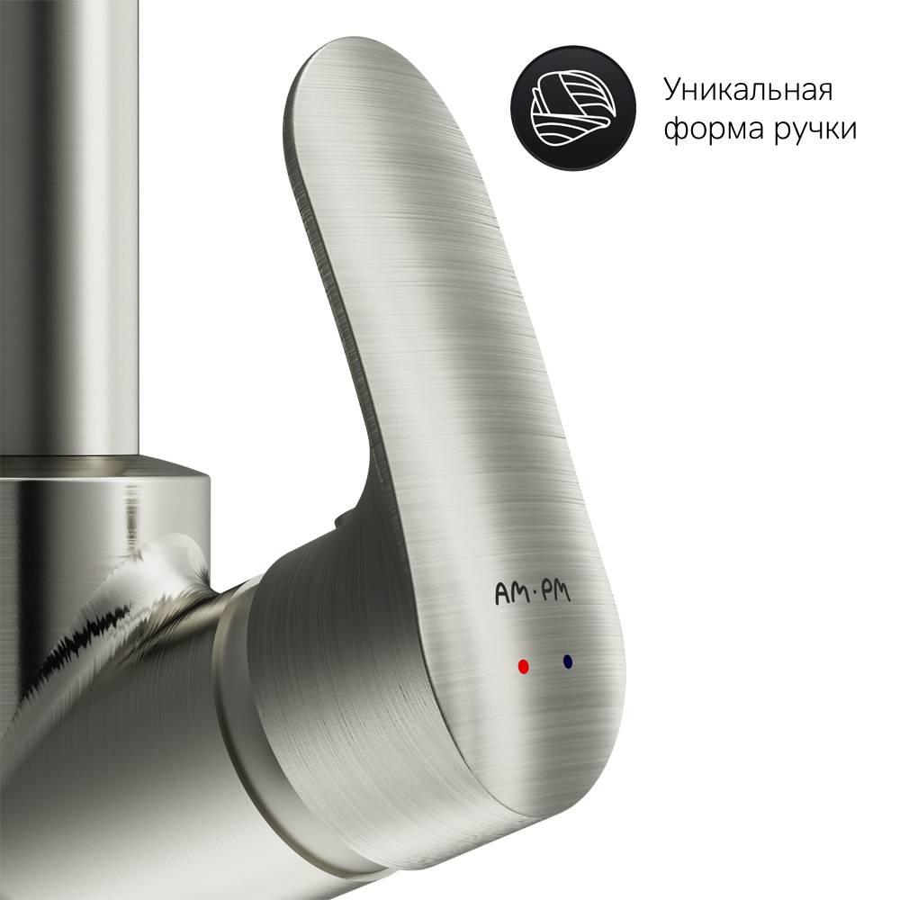 Впервые модный дизайнерский смеситель в доступном сегменте: ультрамодный стиль Dynamic Organic — природные формы в сочетании с четкими линиями доведенными до совершенства человеком. Максимальный комфорт: плавное вращение излива в любом направлении обеспечивает непревзойденное удовольствие от использования и удобство в работе на кухне. Эксклюзивная разработка: специально спроектированный для АМ.РМ керамический картридж SoftMotion 35 мм обеспечивает оптимальную регулировку температуры а также позволяет выдерживать любые перепады давления. Разработан с учетом ваших потребностей и особенностей различных пространств. Высокий излив смесителя Like идеально подойдет для любой раковины поможет вам с легкостью справится с такими задачами как наполнение больших емкостей