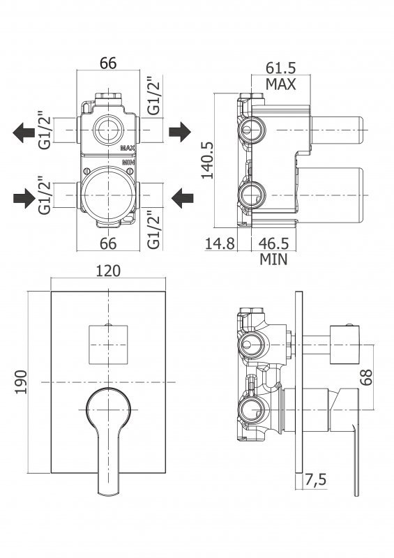 Комплектация: встраиваемый однорычажный смеситель для душа с поворотным переключателем на 3 выхода с комбо положением, со скрытой монтажной частью.