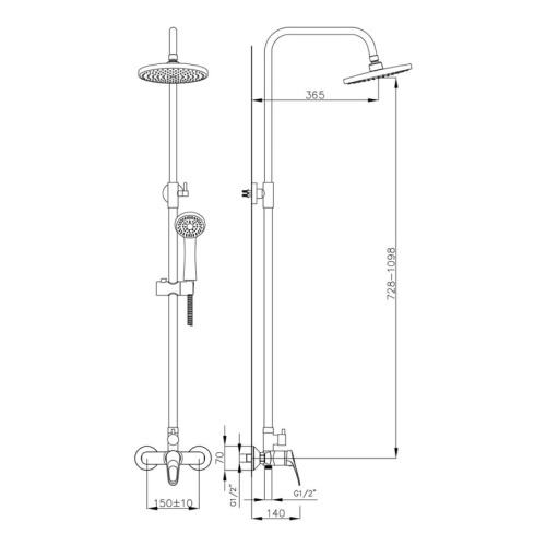 В комплекте: смеситель с поворотным изливом, стойка, верхний (тропический) душ, шланг, регулируемая штанга, ручная лейка.
