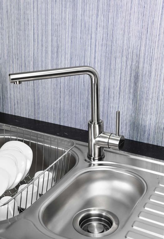 Практичный однорычажный смеситель выполнен в современном стиле и снабжен высоким поворотным изливом;